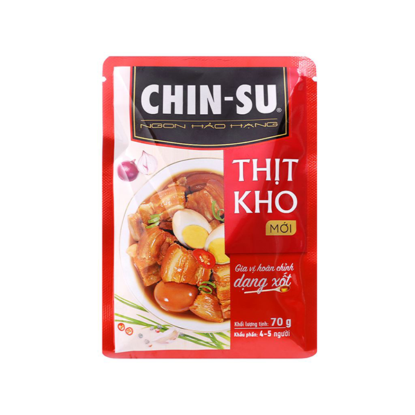 Cách dùng: Ướp 400g thịt với 1 gói xốt Chinsu thịt kho trong khoảng 10 phút. Cho thịt vào nồi, thêm khoảng 1 chén nước và đun sôi. Có thể thêm trứng luộc. Kho nhỏ lửa đến khi thịt mềm thấm vị, lên màu nâu vàng như ý.